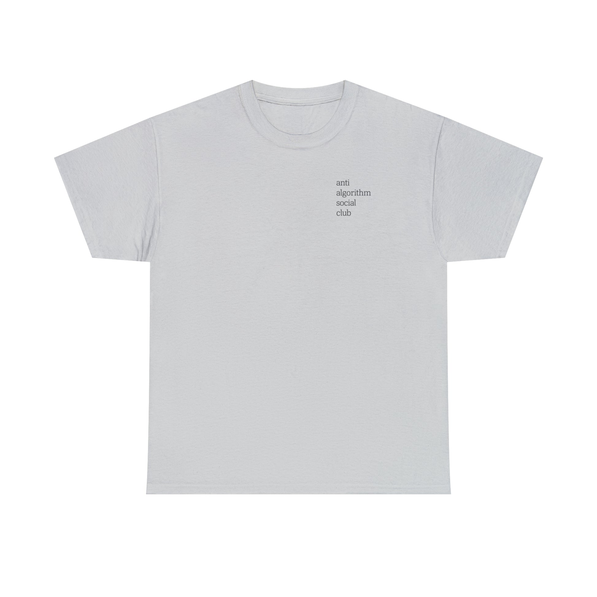 Front and Back, make sure everyone gets a glimpse of the Anti Algorithm Social Club. The timeless heavy cotton tee never goes out of style. Join the Anti Algorithm Revolution!!